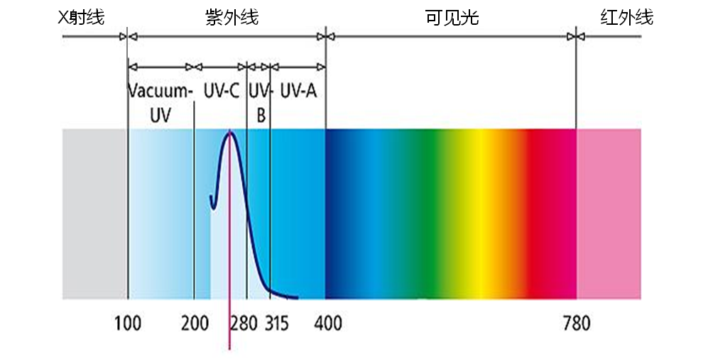 波長介于200~280nm之間,其中240~280nm紫外線為細菌及病毒DNA所吸收,從而破壞細菌及病毒DNA,使其不能復制繁殖。DNA在265nm處具有最大吸收峰。